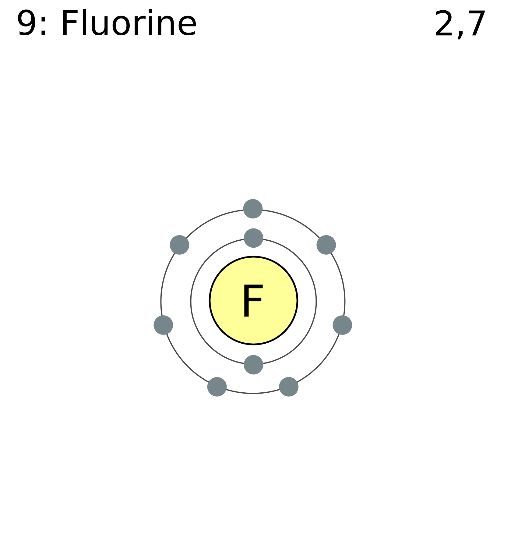 This tells you that the neutral fluorine atom has a total of 9 electrons surrounding its nucleus. Fluorine is a chemical element with atomic number 9 which means there are 9 protons in its nucleus... Consider the example of fluorine.